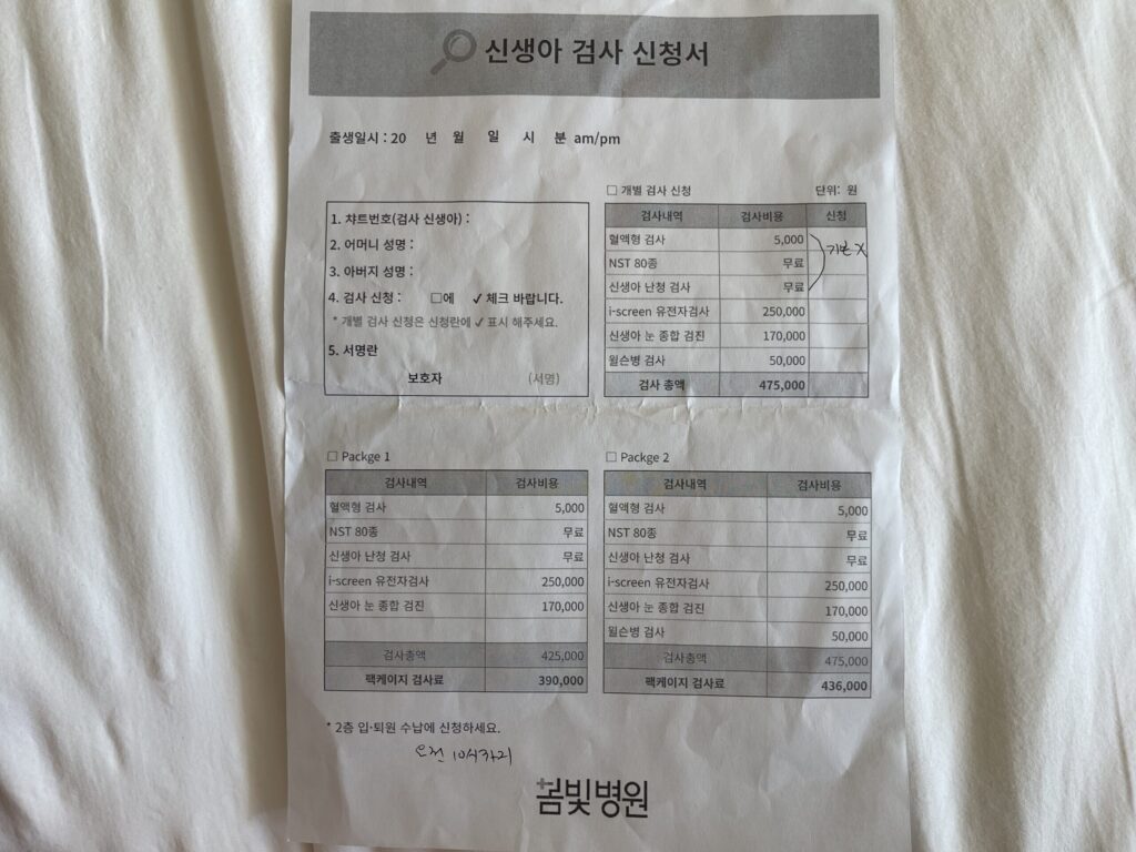 1번과 2번, 혈액검사는 필수라서 봄빛에서 무료로 진행해주고, 3~5번까지 47만원을 주고 검사할 수 있습니다. 새복이 경우에는 태아때 니프티도 했엇고,, 알아보니 3~5번은 큰 의미가 없는 검사라고해서 저희는 진행하지 않았어요.