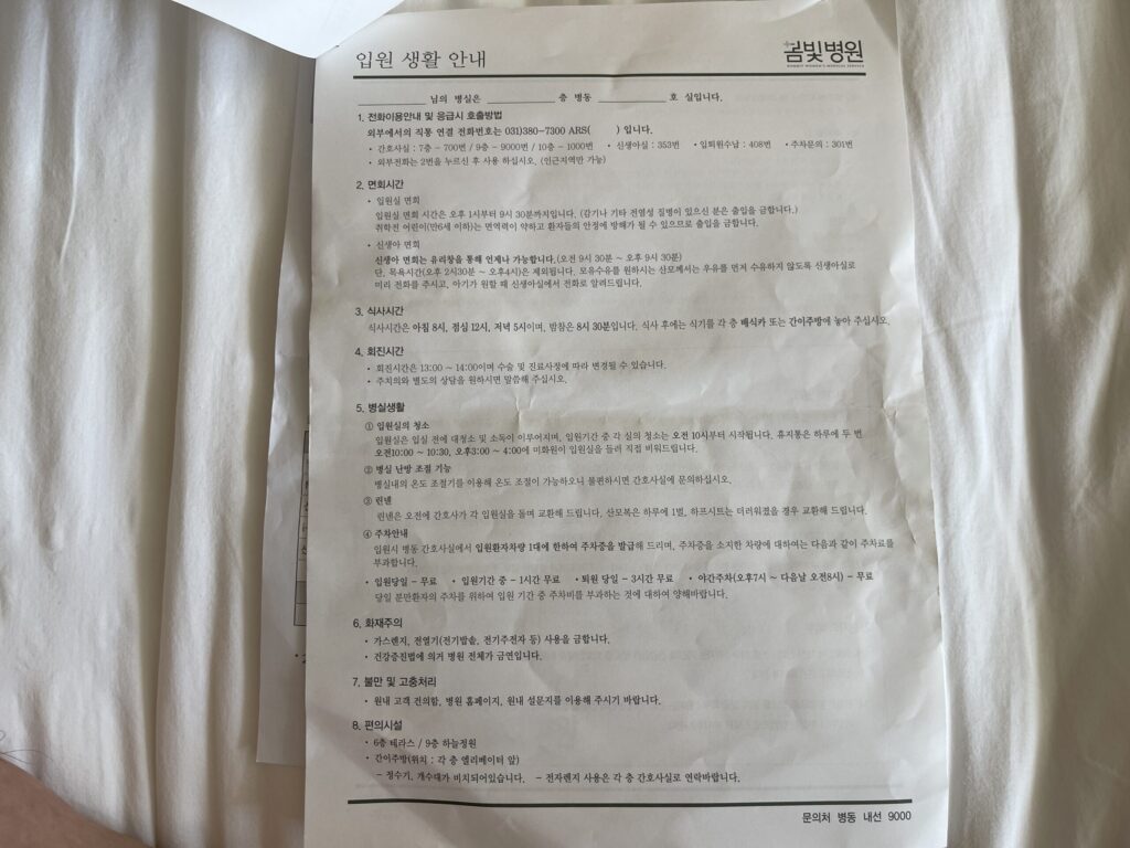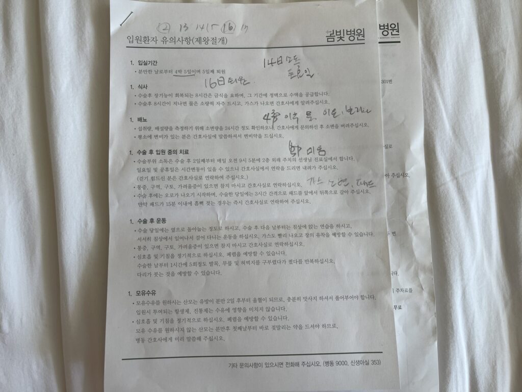 와이프가 약 2시간 30분만에 회복실에 나와 병동으로 이동을 하게됐습니다. 회복실에서 새복이를 직접 만날 수 있었다고 하고, 새복이 만났을 때도 울컥하진 않았는데 와이프를 보니 조금은 울컥했습니다. 울진 않았지만 그래도 산모, 아이 다행히도 건강하다는 사실에 감사했어요. ㅜㅜ 아무튼 병실로 이동해서 유의사항들에 대해서 말씀해주시는데, 이게 참 또 사람 예민하게 만드는게 설명을 너무 성의없게라기 보다는 후딱 해치우고 간다는 느낌으로 간호사분이 해주셨습니다. 처음 해보는 제왕절개인데,, 이런식으로 설명해주면 어떻게 다 안다는거야!! 라는 맘이 속으로 들었고, 모르는건 그냥 재차 계속 물어봤습니다. (산모들이 워낙많아서 이해는 가지만,, 그래도,, ㅜㅜ 그래도… ㅜㅜ)