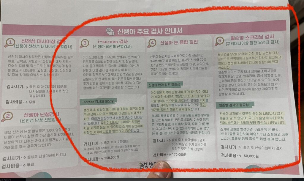 와이프하염없이 기다리다, 간호사분이 길어진다고 밥먹고 오래서, 밥먹고오고 출산 당일에는 1회면회가 가능하다고해서 다녀왔습니다. 5층 신생아실에서 최초 면회를 할 수 있고, 이때에 접종 신청, 진료 신청 등을 작성하게 되는데요. 그 중에서도 신생아 주요 검사 신청을 신생아실에서 안내를 해줍니다.