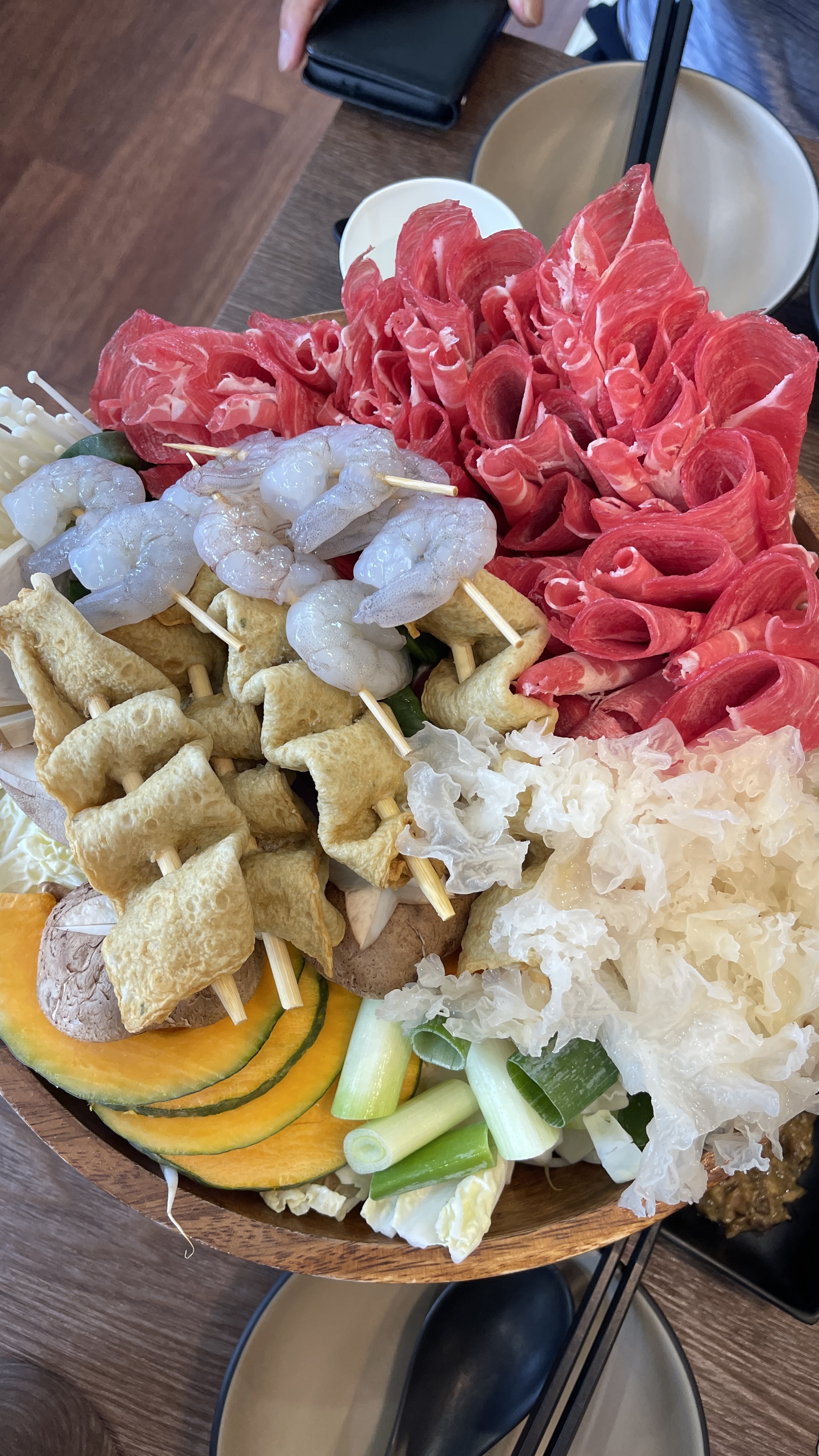 We ordered Course B for four, and the spread was generous from the jump. The meats came in ample slices with a nice marbling, while the veggie bowl was a full-on rainbow—fresh leafy greens, mushrooms, and more. The broth was comforting and balanced, acting as a perfect base that never overpowered the ingredients. The real MVPs were the sauces: the egg–soy combo turned every dip into pure umami (the sesame and chili sauces were solid too, but we kept reaching for that egg–soy). TL;DR: fresh ingredients, quality cuts, and A+ sauces made for a seriously satisfying shabu meal.