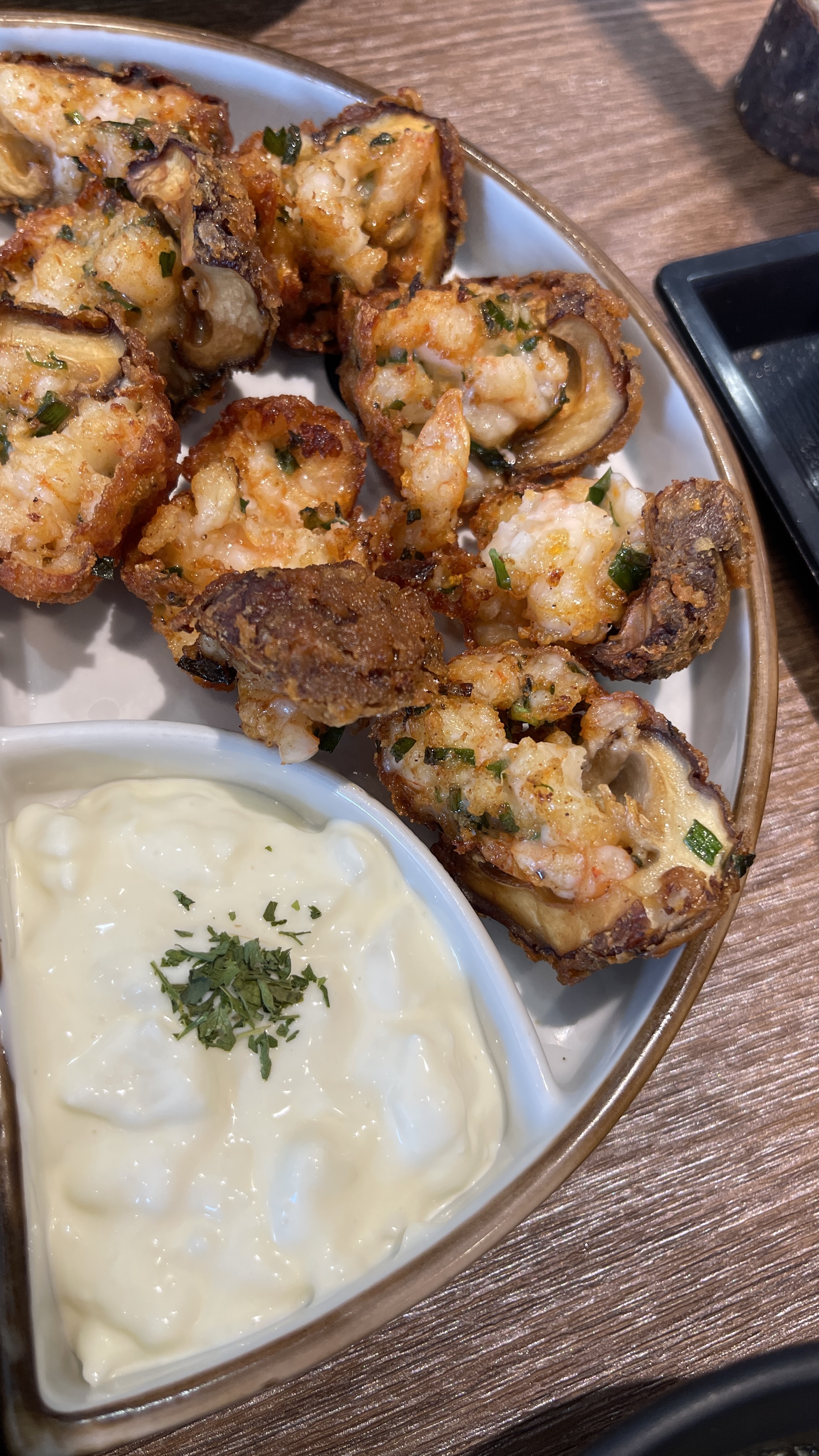 B코스 4인분을 주문했을때 이미지처럼 나온다. 우선 양이 정말 많이 나온다. 고기도 굉장히 많았지만, 저 볼안에 다양한 야채들이 들어있었다. 그리고 양보다 더 좋았던 점은 식재료의 퀄리티였다. 고기와 야채의 신선도가 굉장히 높다는 것을 느낄 수 있었다. 샤브샤브의 육수도 괜찮았지만, 소스가 일품이라고 생각됐다. 계란/간장 소스는 샤브샤브 고기와 야채를 더욱 맛있게 즐길 수 있게 도왔다. 이 외에도 참깨소스, 칠리소스가 있었지만 개인적으로 계란 간장소스가 정말 일품이었다. 정말 너무 괜찮은 한끼! 또 사이드로 버섯 튀김을 주문했는데, 잘익은 표고와 표고 안에 들어있는 속도 훌륭했다. 굿굿!